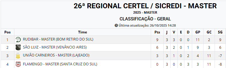 Na tarde do Sábado (25/10/2025), foi realizada a última rodada da fase classificatória do Campeonato Regional Certel / Sicredi - Master.