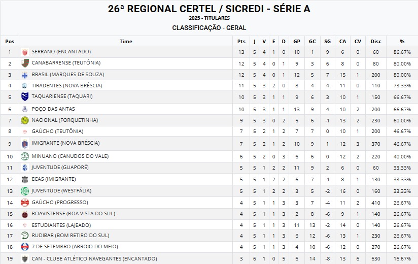 Na tarde de hoje (05/10/2025), foram realizados os confrontos válidos pela rodada transferida (1ª rodada) do Regional Certel / Sicredi - Série A.