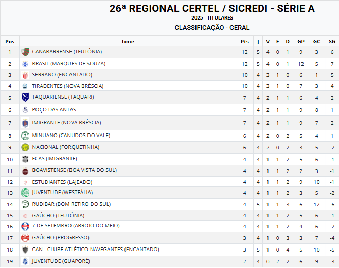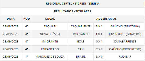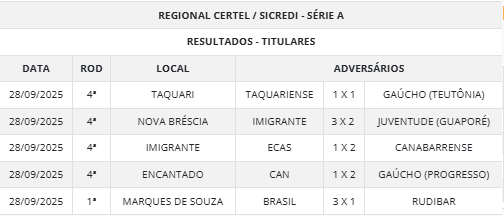 Na tarde de hoje (28/09/2025), foram realizados os confrontos válidos pela 4ª rodada do Regional Certel / Sicredi - Série A. Confira os resultados válidos pela Regional Série A - Titulares: