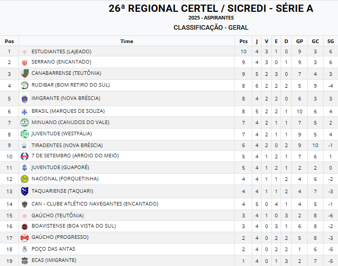Confira também os Resultados válidos Regional Série A - Aspirantes: