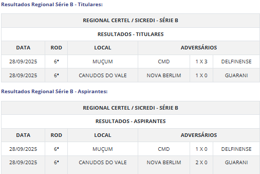 No dia de hoje (28/09/2025), ocorreram os seguintes confrontos válidos pela 6ª rodada do Regional Certel / Sicredi - Série B. Confira os resultados nas categorias Titulares e Aspirantes:
