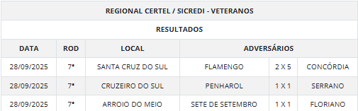 Neste domingo (28/09/2025) ocorreram os confrontos válidos pela 7ª rodada do Campeonato Regional Certel / Sicredi pela categoria Veteranos. Confira os resultados:
