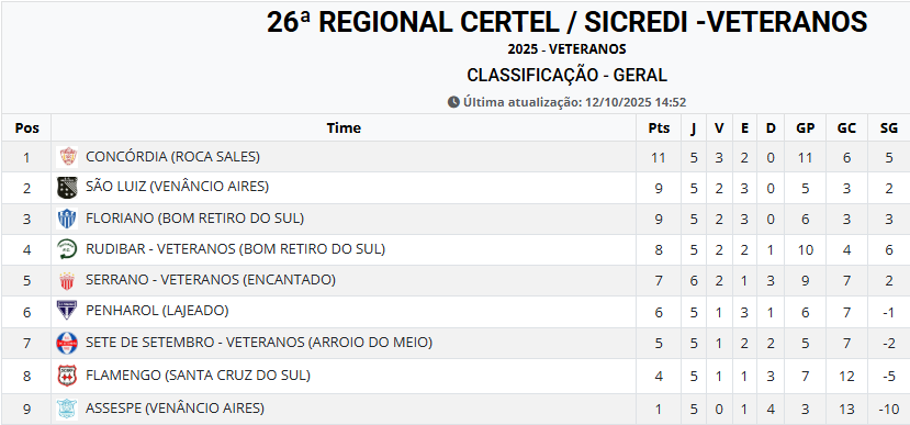 Neste domingo (12/10/2025) ocorreram os confrontos válidos pela 2ª rodada do Campeonato Regional Certel / Sicredi pela categoria Veteranos.